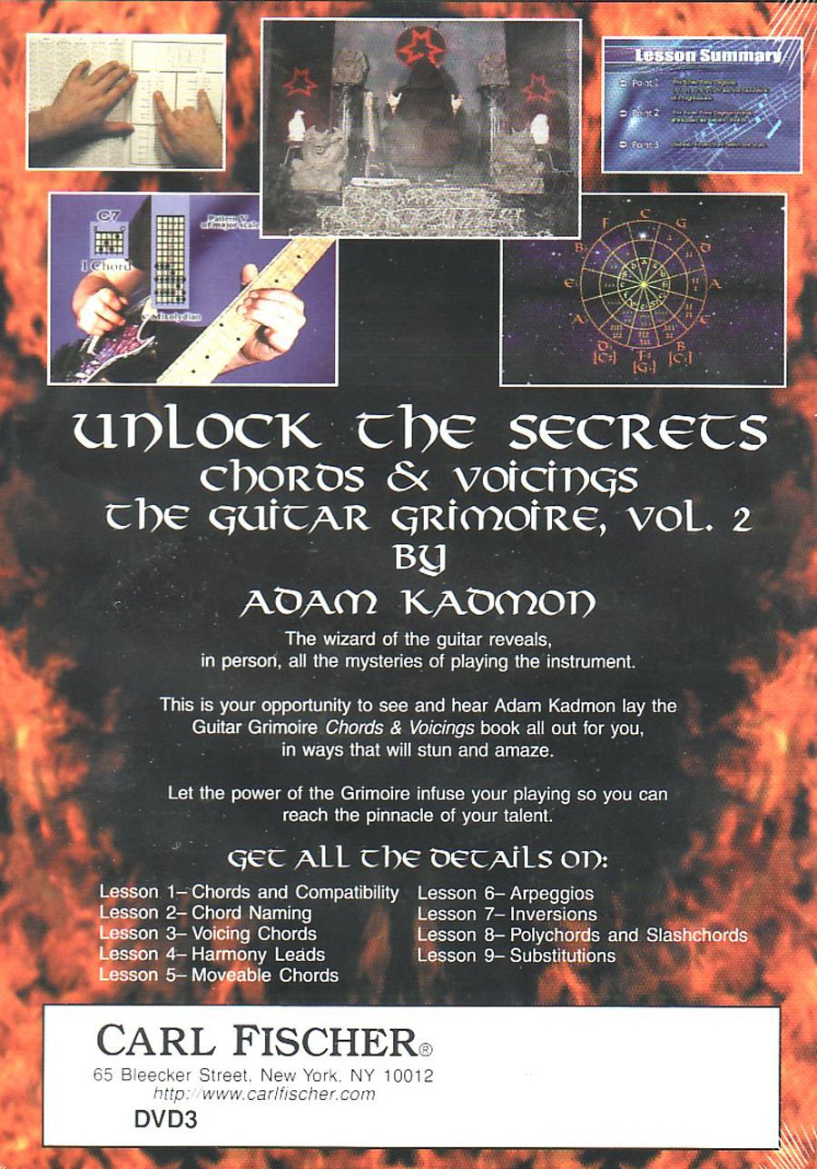 See and hear Adam Kadmon lay The Guitar Grimoire: Chords & Voicings (GT2) all out for you, in ways that will stun and amaze. Accompanies the Guitar Grimoire Chord & Voicings book and covers chords and compatibility, chord naming, voicing chords, harmony leads, moveable chords, and more.