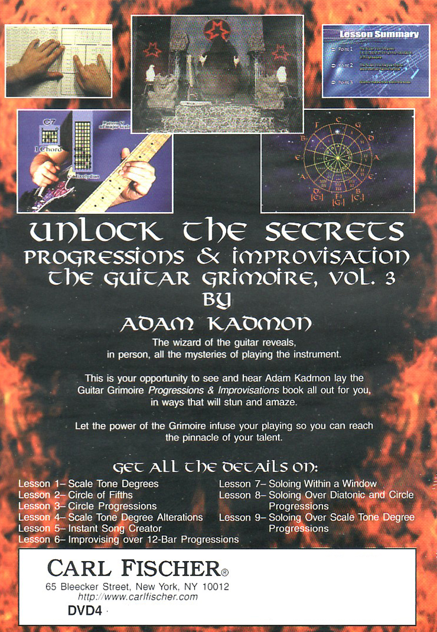 Progressions and Improvisations accompanies the third DVD in Adam Kadmon's Guitar Grimoire Series (DVD4). This volume encompasses the use of chords in progressions and improvisation. Filled with hundreds of exercises and diagrams in Adam Kadmon's unique and path-breaking style of presentation, this book completely examines the craft and universe of progressions. Improvisation and compositional technique are explained and interwoven to create a virtual encyclopedia of melodic and chordal possibilities, styles, dimensions, and potentials. With this book, the player will be able to put the chords, modes, and scales of The Guitar Grimoire to use in creating original music in almost any style.