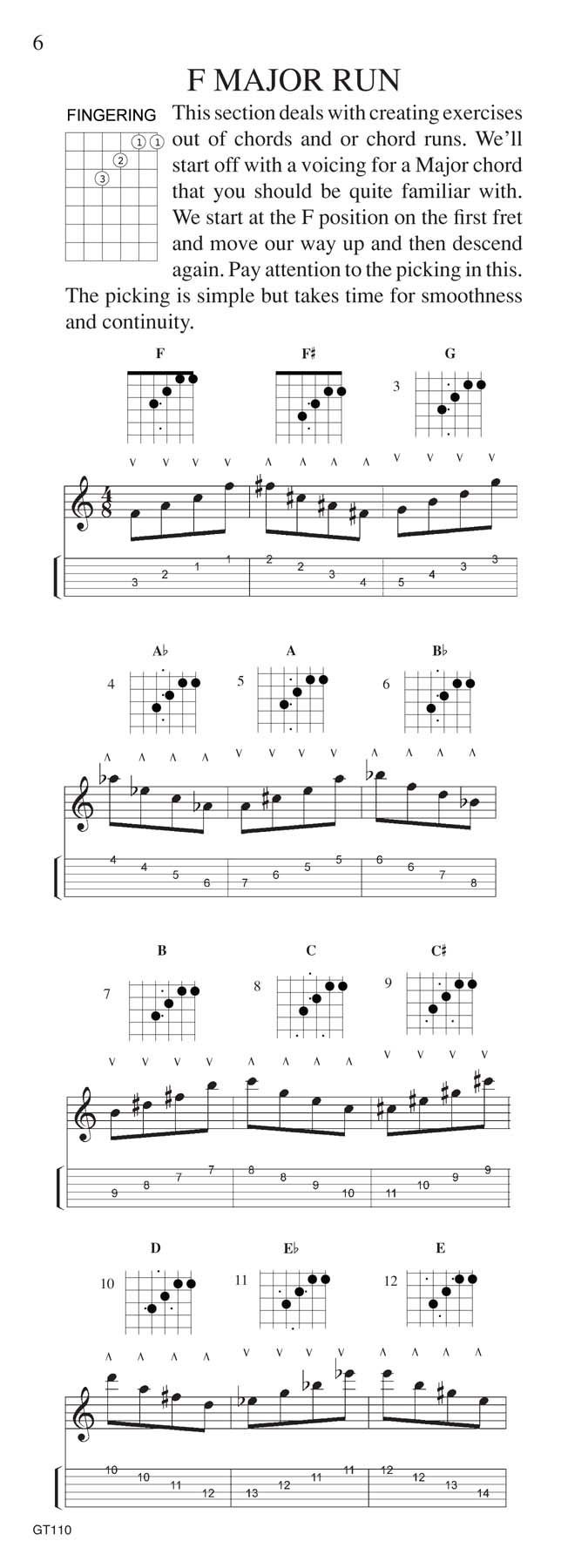 guitarists. Starting with basic fingerpicking chord patterns and expanding to major and minor scales and bass ostinato variations, Kadmon uses thousands of fingerboard diagrams, charts, and musical examples (conventional staff and tablature)