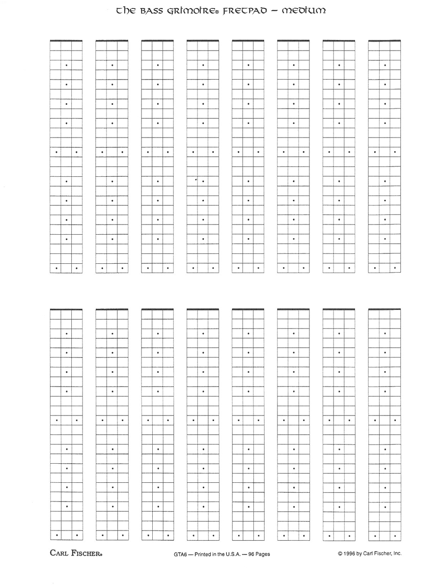 The Bass (medium) Guitar Grimoire Fretpads are pads of paper showing 24-fret-long bass fretboards. This is a quick and easy way to mark down voicings, patterns, and other information you want to keep a record of. 50 sheets each, 16 fretboards per side, 3-hole punched